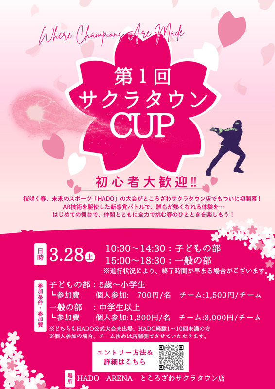 桜咲く春、未来のスポーツ「HADO」の大会がところざわサクラタウン店でもついに初開幕! AR技術を駆使した新感覚バトルで、誰もが熱くなれる体験を・・・ はじめての舞台で、仲間とともに全力で挑む春のひとときを楽しもう!