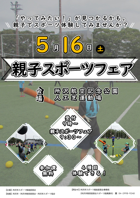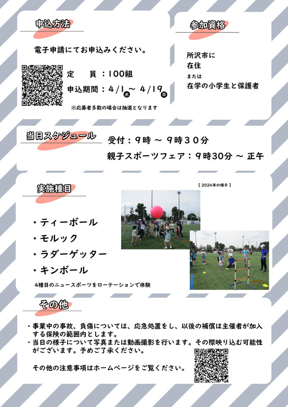 親子で参加できるスポーツフェアを開催します。4種目のニュースポーツ(ティーボール、モルック、ラダーゲッター、キンボール)をローテーションで体験できます。参加費は無料です。参加資格は所沢市に在住または在学の小学生と保護者で、定員は100組です。申込期間は4月1日から4月10日までで、電子申請にてお申込みください。応募者多数の場合は抽選となります。事業中の事故や負傷については、応急処置をし、以後の補償は主催者が加入する保険の範囲内とします。当日の様子について写真または動画撮影を行いますので、予めご了承ください。その他の注意事項はホームページをご覧ください。