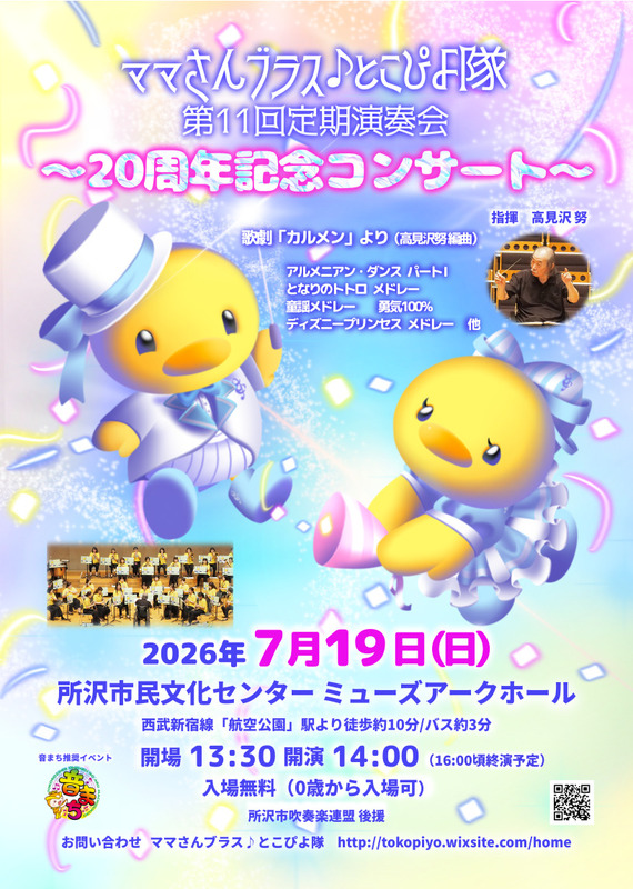ママさんブラス♪とこぴよ隊による第11回定期演奏会が開催されます。20周年記念コンサートとして、歌劇「カルメン」より (高見沢努編曲)、指揮 高見沢努、アルメニアン・ダンスパート、となりのトトロ メドレー、童謡メドレー 勇気100%、ディズニープリンセス メドレー 他が演奏されます。音まち推奨イベントで、入場無料 (0歳から入場可)です。所沢市吹奏楽連盟の後援を受けています。