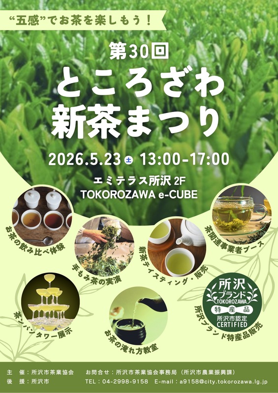 「五感」でお茶を楽しもう! 第30回ところざわ新茶まつりが開催されます。 茶の飲み比べ、幡茶ンパン、まもみ茶の美乳タワー展示、新茶テダスティング、販売、所沢ブランド特産品販売、お茶の淹れ方教室などが行われます。 主催:所沢市茶業協会 後援:所沢市