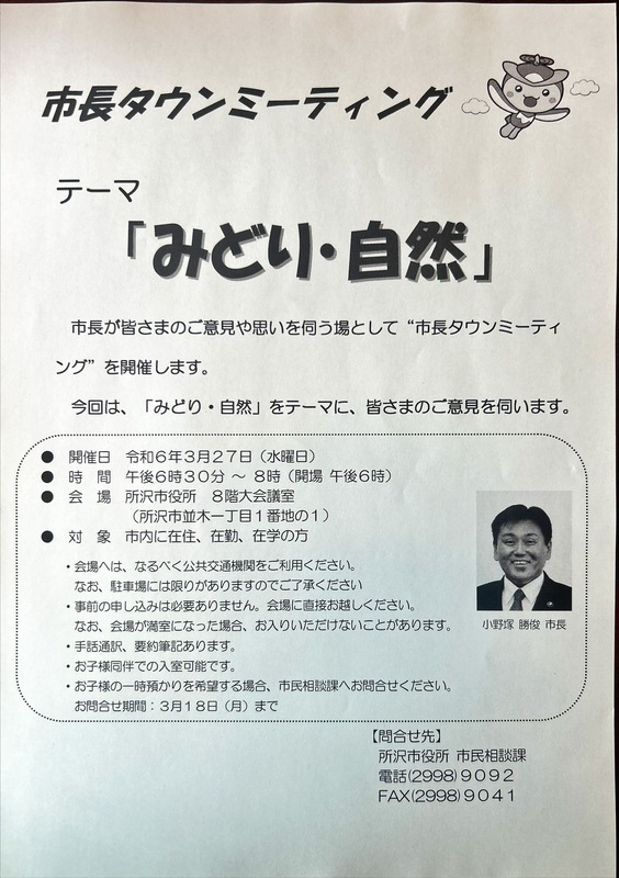 市長が皆さまのご意見や思いを伺う場として “市長タウンミーティング” を開催します。今回は、「みどり 自然」 をテーマに、皆さまのご意見を伺います。対象は市内に在住、在勤、在学の方です。会場へは、なるべく公共交通機関をご利用ください。なお、 駐車場には限りがありますのでご了承ください。事前の申し込みは必要ありません。 会場に直接お越しください。なお、 会場が満室になった場合、 お入りいただけないことがあります。手話通訳、要約筆記あります。お子様同伴での入室可能です。お子様の一時預かりを希望する場合、 市民相談課へお問合せください。お問合せ期間 : 3月18日 (月)まで