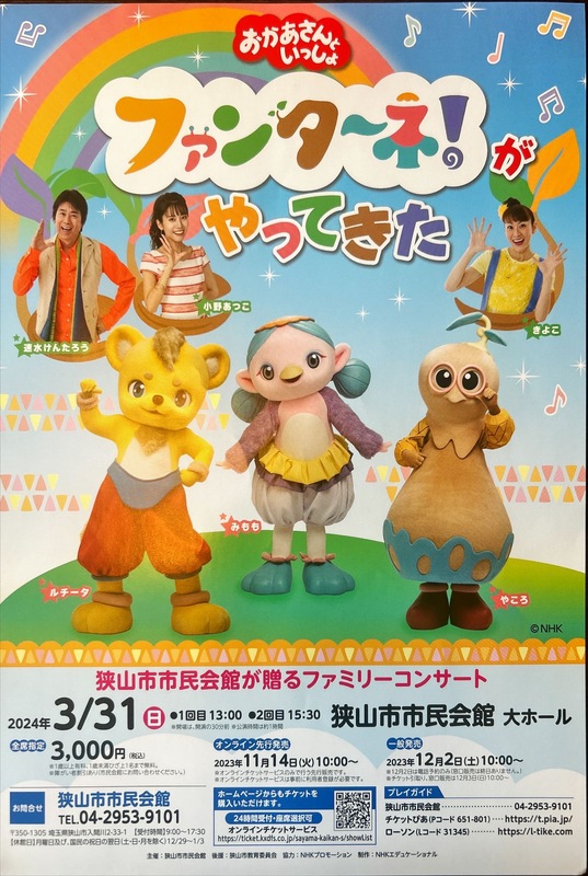 ファンターネ!がやってきた 狭山市市民会館でファミリーコンサートを開催します。全席指定3,000円。1歳以上有料、1歳未満ひざ上1名まで無料。障がい者割引あり。開場は開演の30分前、公演時間は約1時間。オンラインチケットサービスのみで行う先行販売です。オンラインチケットサービスは事前に利用者登録が必要です。