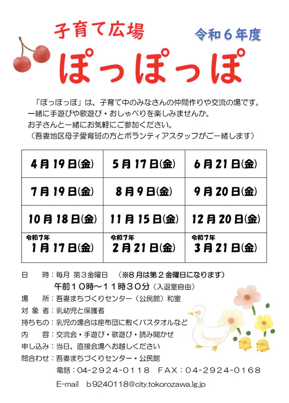 「ぽっぽっぽ」は、子育て中のみなさんの仲間作りや交流の場です。一緒に手遊びや歌遊び おしゃべりを楽しみませんか。お子さんと一緒にお気軽にご参加ください。(吾妻地区母子愛育班の方とボランティアスタッフがご一緒します) 対象者:乳幼児と保護者 持ちもの:乳児の場合は座布団に敷くバスタオルなど 內 容:交流会・手遊び・歌遊び・読み聞かせ 申し込み:当日、 直接会場へお越しください