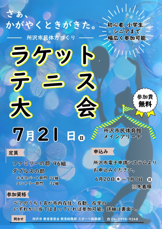 所沢市民体力つくりラケットテニス大会が開催されます。初心者から小学生、シニアまで幅広く参加可能です。参加費は無料です。