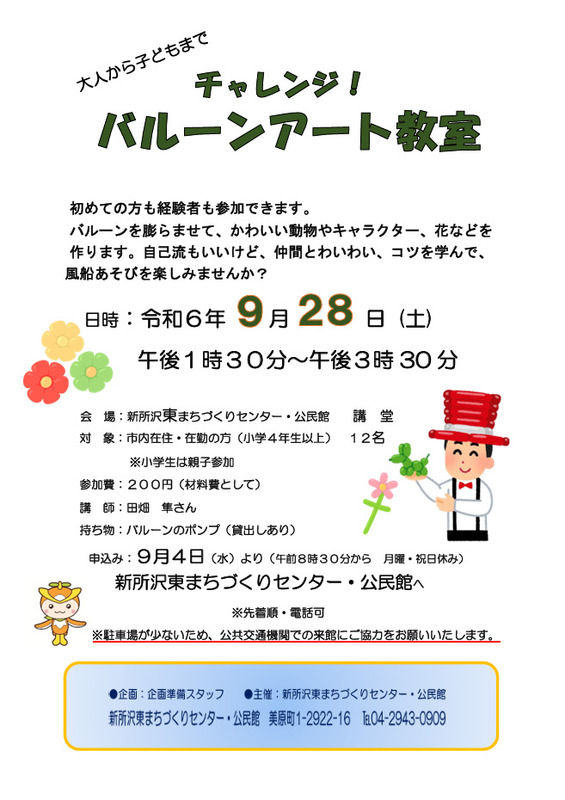 申込み: 9月4日 (水) より (午前8時30分から 月曜・祝日休み) 新所沢東まちづくりセンター・公民館へ