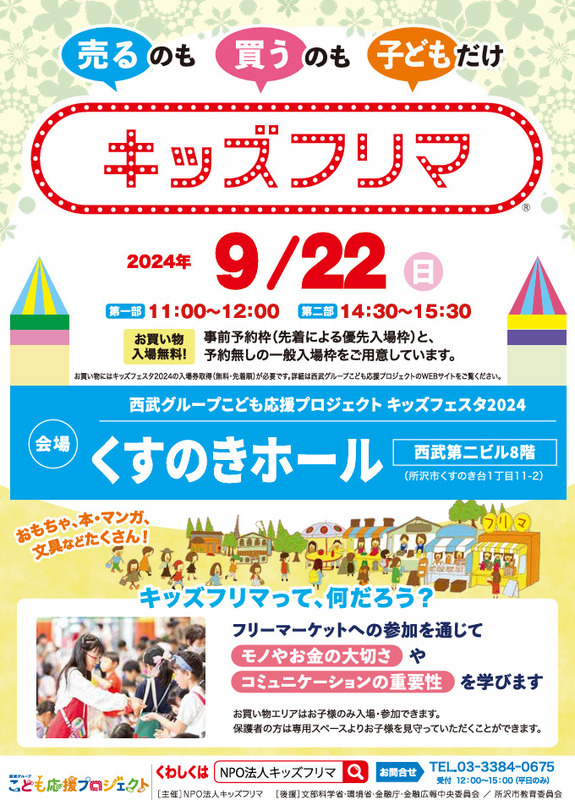 売るのも買うのも子どもだけのキッズフリマです。お買い物にはキッズフェスタ2024の入場券取得(無料・先着順)が必要です。詳細は西武グループこども応援プロジェクトのWEBサイトをご覧ください。お買い物エリアはお子様のみ入場・参加できます。保護者の方は専用スペースよりお子様を見守っていただくことができます。おもちゃ、本・マンガ、文具などたくさん!フリーマーケットへの参加を通じてモノやお金の大切さやコミュニケーションの重要性を学びます。