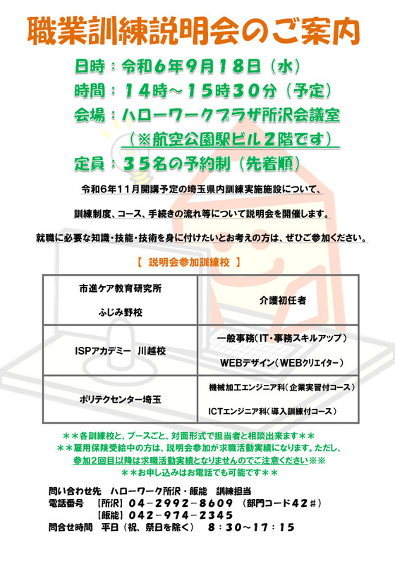 問い合わせ先 ハローワーク所沢・飯能訓練担当