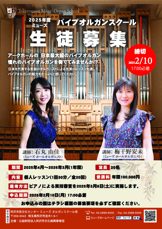 所沢市民文化センター ミューズでは、2025年度のパイプオルガンスクールの生徒を募集しています。アークホールの日本最大級のパイプオルガンを使用し、日本を代表するオルガニストによる充実のレッスンを通じて、パイプオルガンの魅力をたっぷりと感じてください。講師は石丸由佳氏と梅干野安未氏です。期間は2025年4月から2026年3月までの1年間で、定員は20名です。個人レッスンは1回30分、全20回で、年間受講料は100,000円です。選考方法はピアノによる実技審査で、2025年3月8日に実施されます。申込期限は2025年2月10日17:00必着です。詳細はチラシ裏面の募集要項をご確認ください。