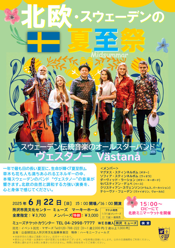 一年で最も日の長い夏至に、生命が輝く『夏至祭』。草木も花も人も満ちあふれるエネルギーの中、本場スウェーデンのバンド“ヴェスタノー”の音楽が響きます。北欧の自然と調和する力強い演奏を、心と身体で感じてください。