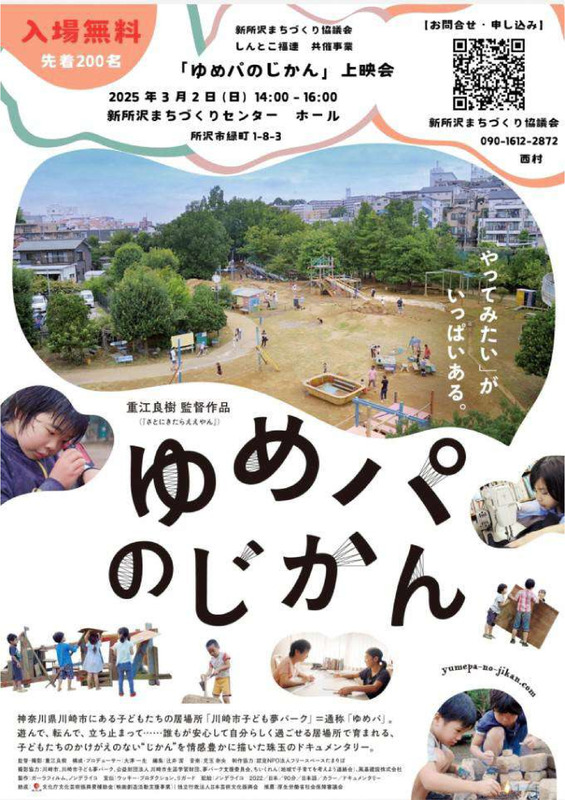 新所沢まちづくり協議会としんとこ福連共催事業として、映画「ゆめパのじかん」の上映会を開催します。神奈川県川崎市にある子どもたちの居場所「川崎市子ども夢パーク」=通称「ゆめパ」を舞台に、子どもたちのかけがえのない時間を描いたドキュメンタリーです。入場無料で、先着200名様までご参加いただけます。予約は3月1日まで、Googleフォームで先着150名、当日受付で先着50名となります。上映後には新所沢地区の子どもの居場所紹介も行われます。お車でのご来場はご遠慮ください。