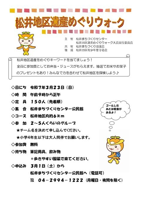 松井地区遺産をめぐりキーワードを当てましょう! 全員に参加賞としてお弁当とジュースがもらえます。抽選でお米やお菓子のプレゼントもあり! みんなで力を合わせて松井地区を探検しよう♪