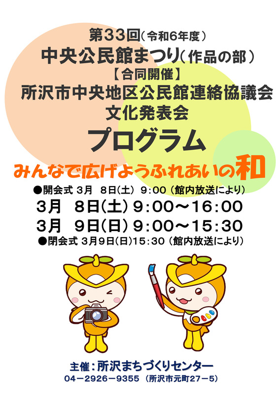 第33回 (令和6年度) 中央公民館まつり (作品の部)が開催されます。所沢市中央地区公民館連絡協議会の文化発表会と合同開催です。開会式は3月8日(土)9:00、閉会式は3月9日(日)15:30に館内放送により行われます。展示案内は1階ロビーと2階ホールで行われ、様々なサークルの作品が展示されます。