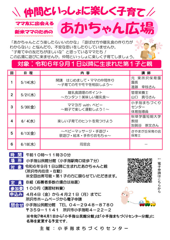新米ママのためのイベント「あかちゃん広場」が開催されます。令和6年9月1日以降に生まれた第1子と親を対象に、同窓会を行います。全回出席可能な方に限ります。参加費は100円で、講習材料費が含まれます。定員は8組で、応募者多数の場合は抽選となります。