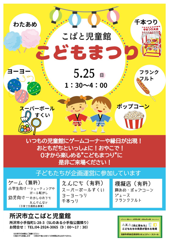 いつもの児童館にゲームコーナーや縁日が出現! おともだちといっしょに! おやこで! 0才から楽しめる”こどもまつり”に是非ご来場ください! 子どもたちが企画運営に参加しています。