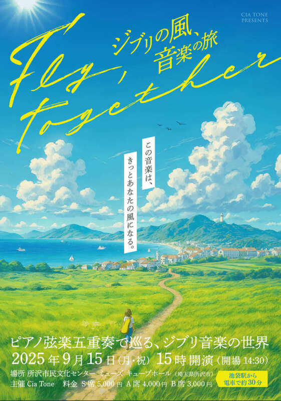 CIA TONE PRESENTS together この音楽は、きっとあなたの風になる。ピアノ弦楽五重奏で巡る、ジブリ音楽の世界。開場は14:30です。料金はS席 5,000円、A席 4,000円、B席 3,000円です。池袋駅から電車で約30分。