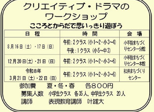 こころとからだで思いっきり遊ぼう 午前: 2クラス (小1~2・小3~6) 参加費: 夏・冬・春 各800円 募集人数: 小学生クラス 各35人、 中学生クラス 20人 講師: 表現教育講師 叶雄大