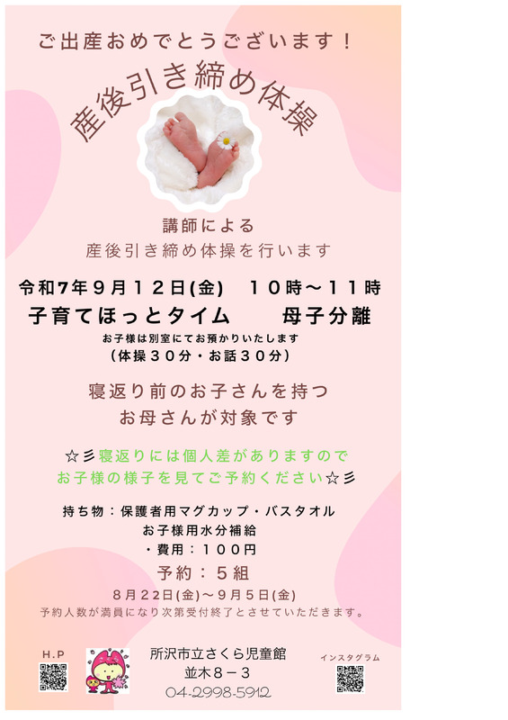 講師による産後引き締め体操を行います。子育てほっとタイムとして、母子分離でお子様は別室にてお預かりいたします。体操30分・お話30分のプログラムです。寝返り前のお子さんを持つお母さんが対象です。寝返りには個人差がありますので、お子様の様子を見てご予約ください。持ち物は保護者用マグカップ・バスタオル、お子様用水分補給です。費用は100円です。予約は5組までで、8月22日(金)から9月5日(金)まで受付します。予約人数が満員になり次第受付終了とさせていただきます。