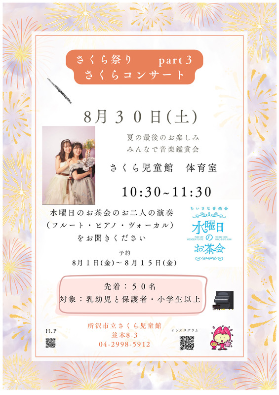 夏の最後のお楽しみ、みんなで音楽鑑賞会を開催します。水曜日のお茶会のお二人の演奏をお聞きください。予約は8月1日(金)から8月15日(金)まで、先着50名です。対象は乳幼児と保護者・小学生以上です。