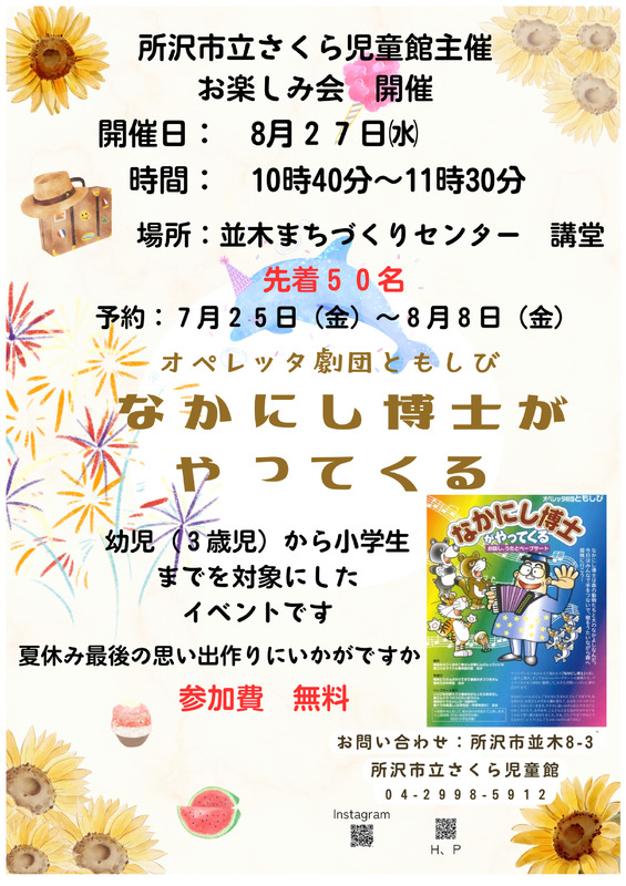 所沢市立さくら児童館主催のお楽しみ会が開催されます。なかにし博士がやってきます。幼児(3歳児)から小学生までを対象にしたイベントです。夏休み最後の思い出作りにいかがですか。参加費は無料です。予約は7月25日(金)から8月8日(金)まで、先着50名です。