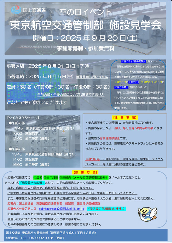 国土交通省 東京航空交通管制部 総務課 施設見学受付担当 応募先メールアドレス: