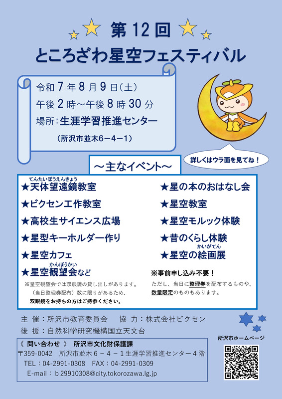 第12回 ところざわ星空フェスティバルが開催されます。主なイベントには、天体望遠鏡教室、星の本のおはなし会、ビクセン工作教室、高校生サイエンス広場、星型キーホルダー作り、星空カフェ、星空観望会、星空教室、星空モルック体験、昔のくらし体験、星空の絵画展などがあります。星空観望会では双眼鏡の貸し出しがありますが、数に限りがあるため、双眼鏡をお持ちの方はご持参ください。事前申し込みは不要ですが、当日に整理券を配布するものや、数量限定のものもあります。駐車場は午後5時30分まではグラウンドを開放しますが、午後5時30分以降は観望会準備のため使用できません。公共交通機関の利用をお勧めします。