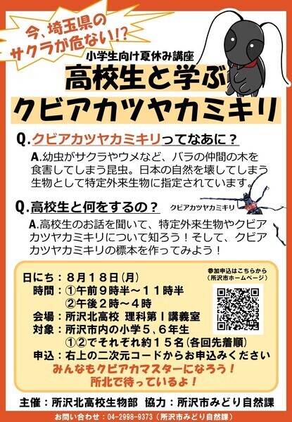 埼玉県のサクラが危ない!? 小学生向け夏休み講座を開催します。高校生と一緒に、特定外来生物であるクビアカツヤカミキリについて学び、標本を作ってみましょう。対象は所沢市内の小学5、6年生で、各回約15名の先着順です。参加申込は所沢市ホームページの右上の二次元コードからお願いします。