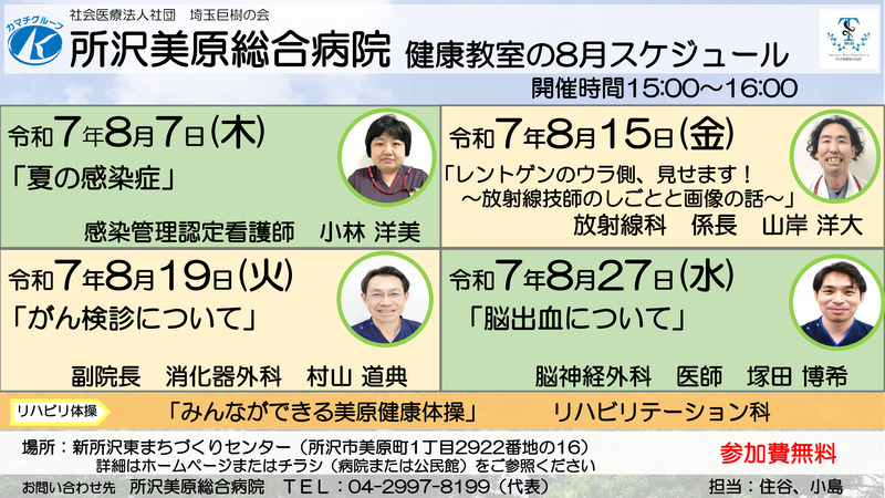 所沢美原総合病院 健康教室の8月スケジュールです。 8月27日(水)に「脳出血について」の講座を開催します。 参加費は無料です。 詳細はホームページまたはチラシ(病院または公民館)をご参照ください。