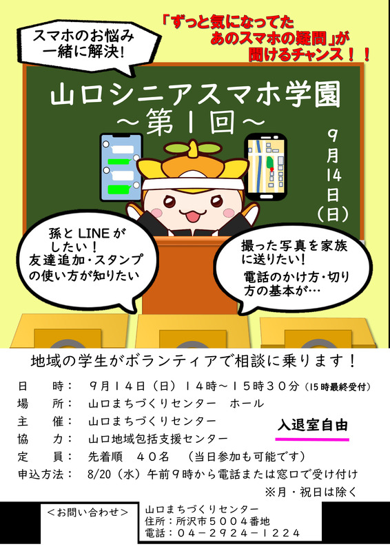 スマホに関する疑問を解決するチャンスです。地域の学生がボランティアで相談に乗ります。孫とLINEがしたい、友達追加やスタンプの使い方、撮った写真を家族に送りたい、電話のかけ方・切り方の基本など、スマホに関する様々な疑問にお答えします。入退室自由で、定員は先着順40名です。当日参加も可能です。申込は8月20日(水)午前9時から電話または窓口で受け付けます(月・祝日は除く)。