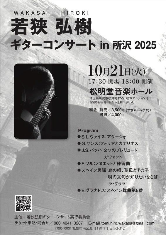 若狭弘樹によるギターコンサートが所沢で開催されます。