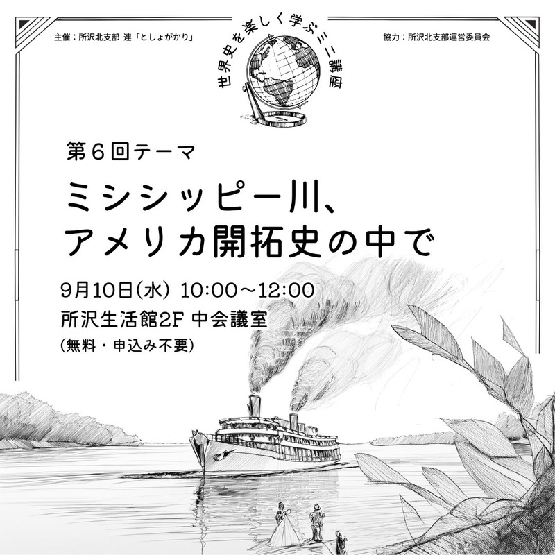 主催: 所沢北支部連 「としょがかり」 協力: 所沢北支部運営委員会 第6回テーマ: ミシシッピー川、アメリカ開拓史の中で 参加費無料・申込み不要