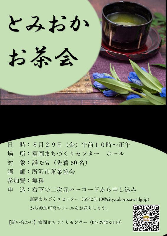 とみおかお茶会が開催されます。対象は誰でも参加可能で、先着60名です。講師は所沢市茶業協会の方々です。参加費は無料です。申し込みは右下の二次元バーコードから行ってください。富岡まちづくりセンター (