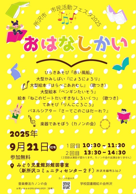 市民活動フェスタでのおはなしかいが開催されます。 2回目の演目は1回目と異なり、カノンの会の出演はありません。 参加無料です。