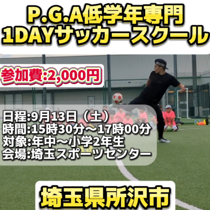 P.G.A低学年専門の1DAYサッカースクールが開催されます。参加費は2,000円で、対象は年中から小学2年生です。