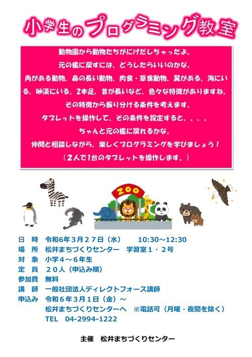 動物園から動物たちがにげだしちゃったよ。元の檻に戻すには、どうしたらいいのかな。角がある動物 鼻の長い動物、 肉食 草食動物、 翼がある、 海にいある、砂漠にいる 2本足、首が長いなど、色々な特徴がありますね。その特徴から振り分ける条件を考えます。タブレットを操作して、その条件を設定すると、、、ちゃんと元の檻に戻れるかな。仲間と相談しながら、楽しくプログラミングを学びましょう! (2人で1台のタブレットを操作します。) 対象は小学4~6年生で、定員は20人(申込み順)、参加費は無料です。講師は一般社団法人ディレクトフォース講師が担当します。