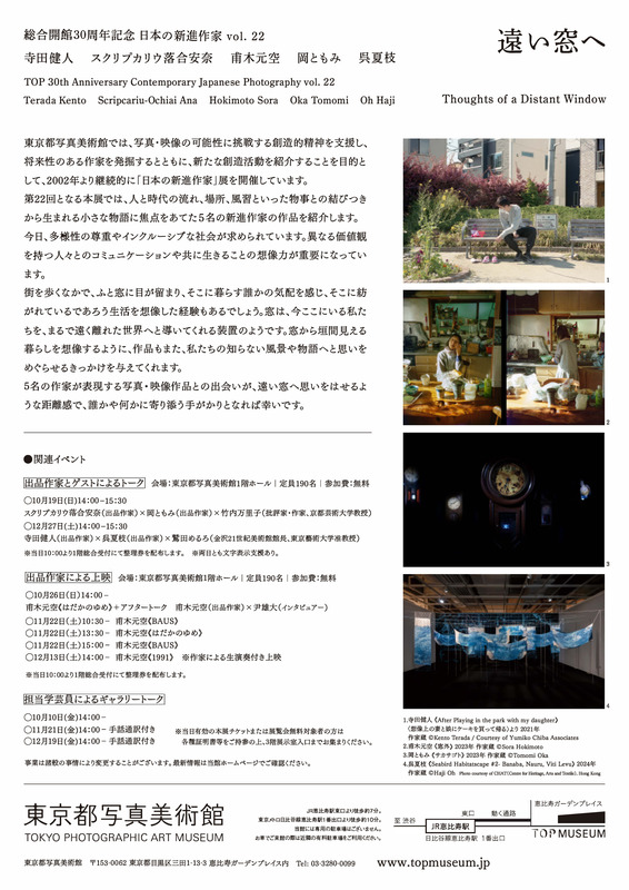 東京都写真美術館では、写真・映像の可能性に挑戦する創造的精神を支援し、将来性のある作家を発掘するとともに、新たな創造活動を紹介することを目的として、2002年より継続的に「日本の新進作家」展を開催しています。第22回となる本展では、人と時代の流れ、場所、風習といった物事との結びつきから生まれる小さな物語に焦点をあてた5名の新進作家の作品を紹介します。開館時間は10:00-18:00 (木・金は20:00まで)で、入館は閉館の30分前までです。休館日は毎週月曜日(月曜日が祝休日の場合開館し、翌平日休館)、年末年始(12/29-1/1)です。観覧料は一般700(560)円、学生560(440)円、高校生・65歳以上350(280)円です。中学生以下および障害者手帳をお持ちの方とその介護者(2名様まで)は無料です。1月2日(金)、3日(土)は無料で、第3水曜日は65歳以上無料です。各種割引の併用はできません。本展はオンラインによる日時指定チケットが購入できます。関連イベントとして、出品作家とゲストによるトークや出品作家による上映、担当学芸員によるギャラリートークが予定されています。