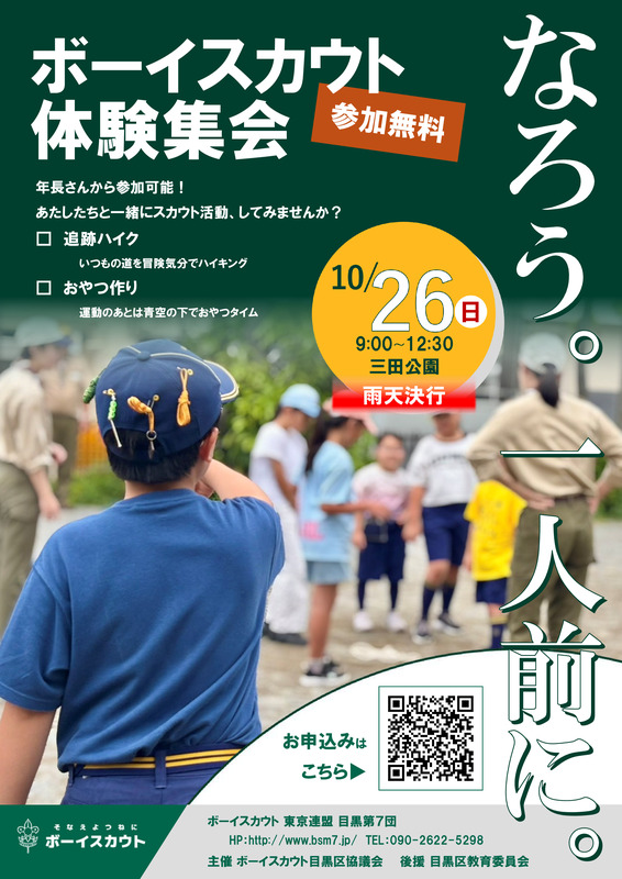 TEL: 090-2622-5298 主催: ボーイスカウト目黒区協議会 後援: 目黒区教育委員会