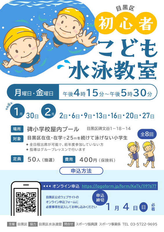 目黒区在住・在学で25mを続けて泳げない小学生を対象とした初心者こども水泳教室です。全日程出席が可能で、前年度参加していない方が対象です。指導はグループレッスンで行います。定員は50人で抽選となります。費用は400円(保険料)です。申込は目黒区公式ウェブサイトのオンライン申込フォームから行ってください。締切は1月4日必着です。