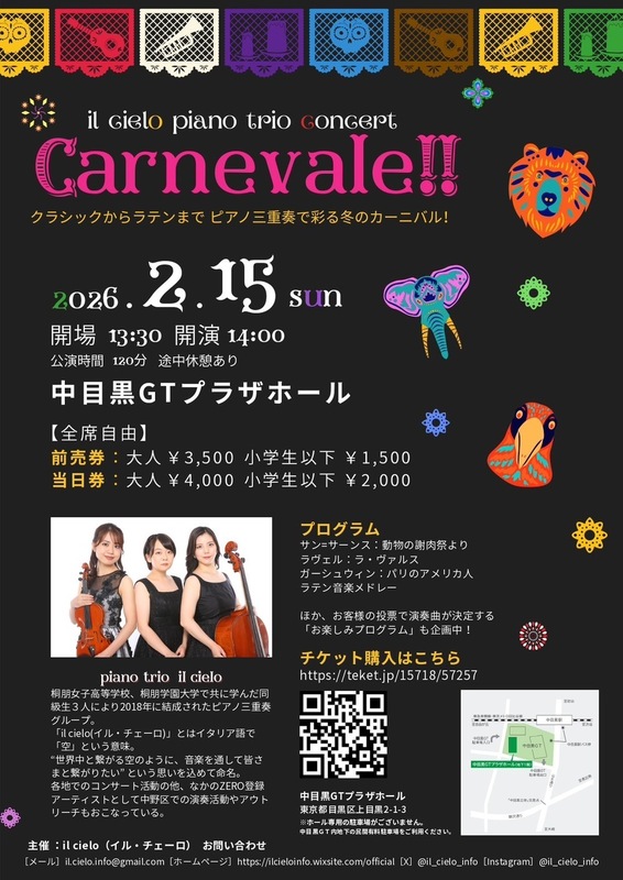 クラシックからラテンまでピアノ三重奏で彩る冬のカーニバル! 開場 13:30 開演 14:00 公演時間 120分 途中休憩あり 【全席自由】 前売券:大人 ¥3,500 小学生以下 ¥1,500 当日券:大人¥4,000 小学生以下 ¥2,000 プログラム サン=サーンス: 動物の謝肉祭より ラヴェル:ラ・ヴァルス ガーシュウィン:パリのアメリカ人 ラテン音楽メドレー ほか、お客様の投票で演奏曲が決定する「お楽しみプログラム」も企画中! チケット購入はこちら