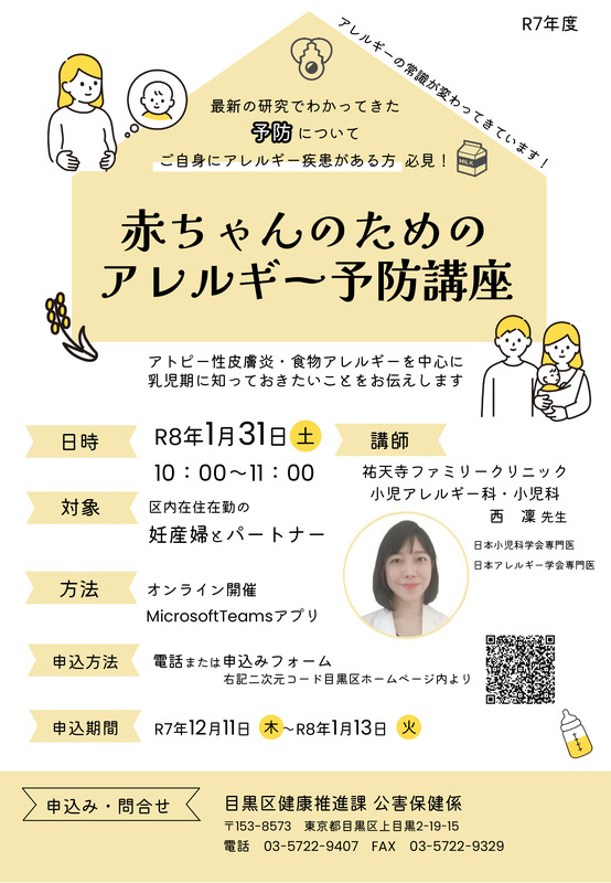 最新の研究でわかってきた予防についてご自身にアレルギー疾患がある方必見! MILK 赤ちゃんのためのアレルギー予防講座 アトピー性皮膚炎・食物アレルギーを中心に乳児期に知っておきたいことをお伝えします。講師は祐天寺ファミリークリニック 小児アレルギー科・小児科の西凜先生です。日本小児科学会専門医、日本アレルギー学会専門医。対象は区内在住在勤の妊産婦とパートナーです。