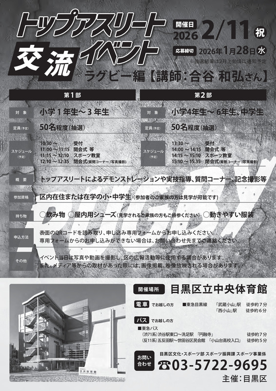 トップアスリート交流イベントが開催されます。講師は元プロラグビー選手の合谷和弘さんです。対象は小学4年生から中学生で、スポーツ教室やデモンストレーション、質問コーナー、記念撮影などが行われます。参加は無料で、定員は50名程度(抽選)です。参加資格は区内在住または在学の小・中学生で、参加者のご家族の方は見学が可能です。持ち物は飲み物、屋内用シューズ、動きやすい服装です。申込はQRコードから専用フォームで行います。申込締切は2026年1月28日です。