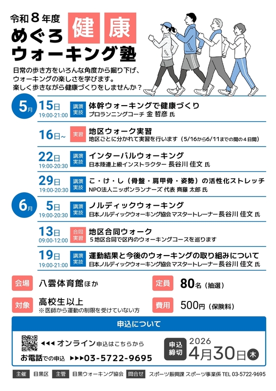 主催: 目黒区 主管: 目黒ウォーキング協会 問合せ: スポーツ振興課 スポーツ事業係 TEL 03-5722-9695