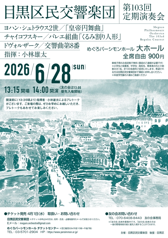 目黒区民交響楽団による定期演奏会が開催されます。プログラムには、ヨハン・シュトラウス2世の「皇帝円舞曲」、チャイコフスキーのバレエ組曲「くるみ割り人形」、ドヴォルザークの交響曲第8番が含まれています。指揮は小林雄太が務めます。開演前には指揮者によるプレトークもございますので、ぜひお早めにお越しください。全席自由で900円、車椅子席は無料ですが事前連絡が必要です。小学生と保護者、中学生・高校生、障害者と介助者の方1名を計100名様ご招待いたします。未就学児童の入場はご遠慮ください。