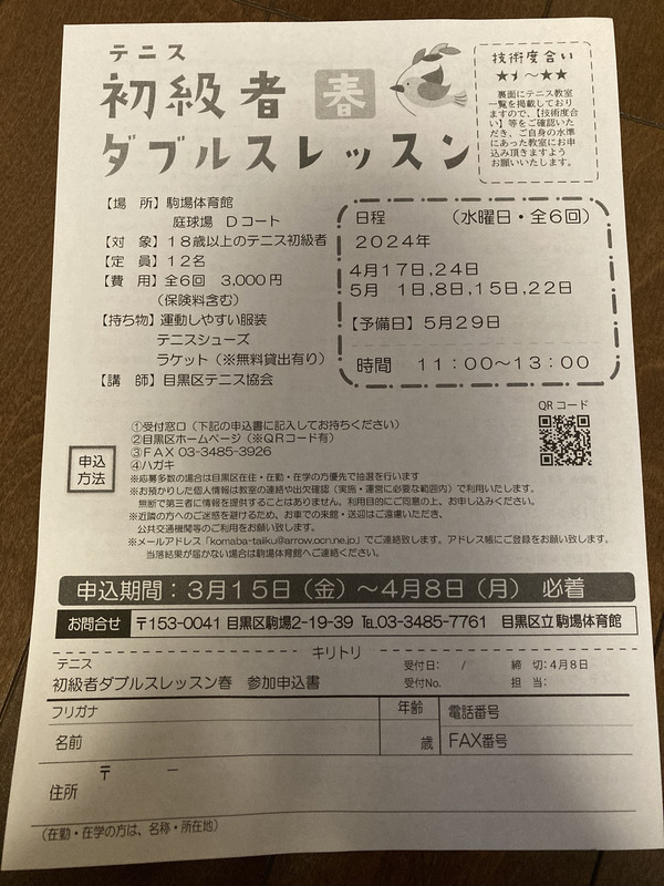 18歳以上のテニス初級者を対象としたダブルスレッスンが開催されます。全6回で費用は3,000円です。開催日は4月17日、24日、5月1日、8日、15日、22日の11:00から13:00までです。予備日は5月29日です。運動しやすい服装、テニスシューズ、ラケットを持参してください(ラケットは無料で貸出あり)。講師は目黒区テニス協会です。申込期間は3月15日から4月8日までです。