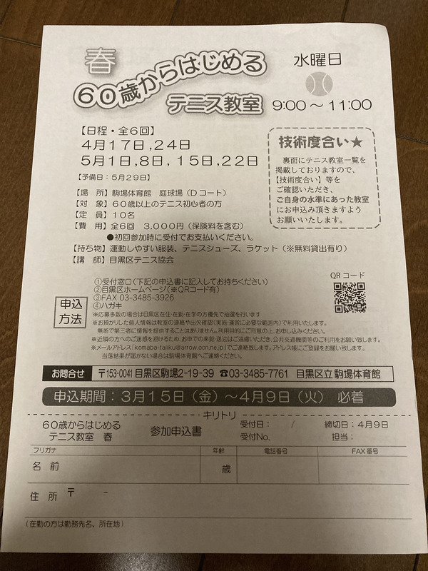 60歳以上のテニス初心者の方を対象としたテニス教室が開催されます。全6回で、日程は4月17日, 24日、5月1日,8日,15日,22日、予備日は5月29日です。定員は10名で、費用は全6回 3,000円 (保険料を含む)です。運動しやすい服装、テニスシューズ、ラケットを持参してください(ラケットは無料貸出有り)。講師は目黒区テニス協会です。申込方法は受付窓口、目黒区ホームページ、FAX、ハガキから選べます。応募多数の場合は目黒区在住・在勤・在学の方優先で抽選を行います。