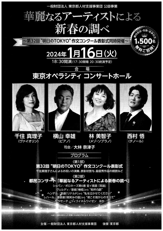 一般財団法人 東京都人材支援事業団が主催する公益事業「新春の調べ」が2024年1月16日に開催されます。開演は18:30、開場は17:30、終演予定は20:30です。会場は東京オペラシティコンサートホールです。同時に第32回 “明日のTOKYO” 作文コンクールの表彰式も開催されます。出演者は千住真理子さん(ヴァイオリン)、横山幸雄さん(ピアノ)、林美智子さん(メゾ・ソプラノ)、西村悟さん(テノール)など。プログラムは第1部で作文コンクールの表彰式、第2部で都民コンサート「華麗なるアーティストによる新春の調べ」が行われます。曲目、曲順は都合により変更になる場合があります。