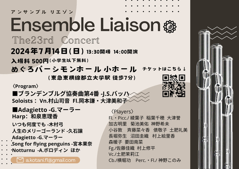 Soloists : Vn. 村山司音 FI.岡本謙 大津美和子
