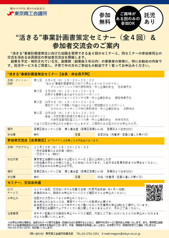 お申込み時の情報は、当該セミナーに関する連絡・記録のために使用するとともに、講師や託児サービス委託先と共有いたします。また、東京商工会議所からの各種情報提供のために使用する場合がございます。今後、情報提供を希望しないときは、お手数ですが、目黒支部までご連絡 (TELまたはFAX: 03-3791-3573) をお願いいたします。