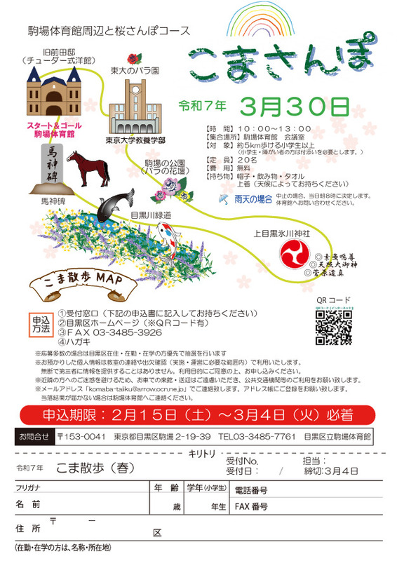 駒場体育館周辺と桜さんぽコースを開催します。対象は約5km歩ける小学生以上で、定員は20名です。参加費は無料です。帽子、飲み物、タオル、上着(天候によってお持ちください)を持参してください。小学生や障がい者の方は付添いが必要です。雨天の場合は中止となり、当日朝8時に決定します。体育館へお問い合わせください。公共交通機関をご利用ください。