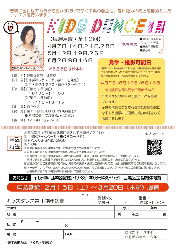 音楽に合わせてカラダを動かすだけでなく子供の自主性、身体能力の向上を目的としたレッスンを行います。対象は新小学3~6年生で、定員は各20名です。費用は全10回で5,000円(保険料含む)です。運動できる服装(スカート不可)で、屋内用運動靴と飲み物を持参してください。見学・撮影可能日は4月7日、5月19日、6月16日です。申込期間は2月15日から3月20日までです。