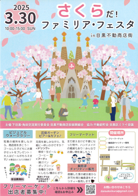 さくらだ! ファミリア・フェスタが目黒不動商店街で開催されます。ビジュアルウォークラリーでは、写真の場所を探しながら商店街を歩き、ゴールした子どもにはお菓子セット、大人にはビールがプレゼントされます(景品がなくなり次第終了)。花見ガーデンビアー&カフェでは、格安の生ビールやコーヒー、揚げパン、ポップコーン、各種おつまみが提供されます。また、フリーマーケットや輪島塗のチャリティー販売も行われます。